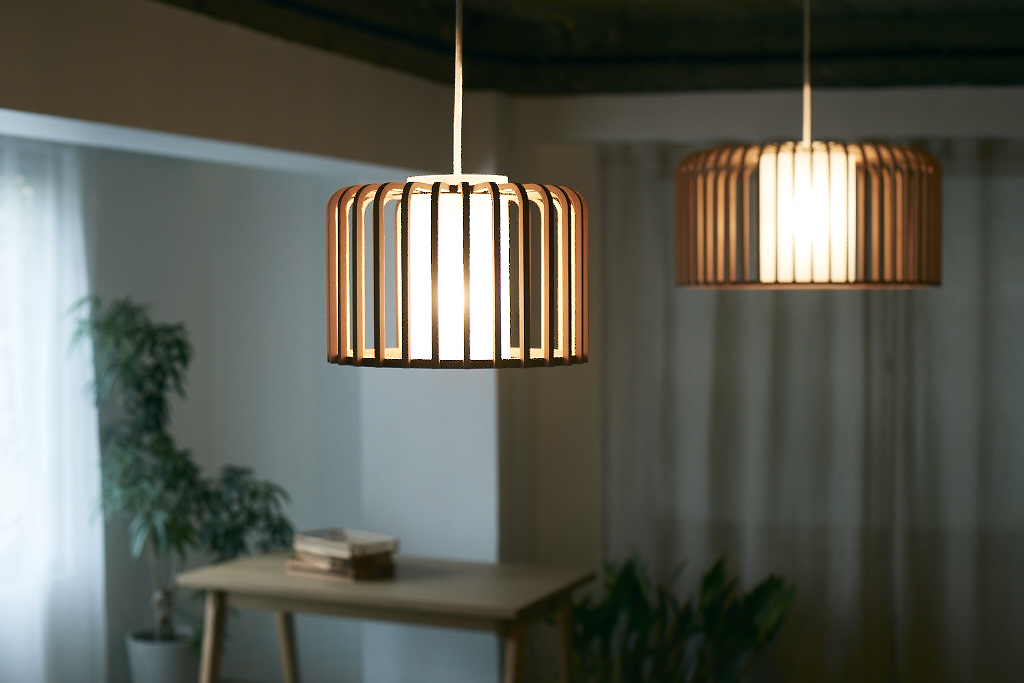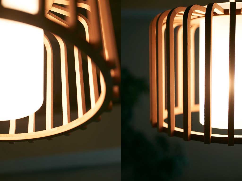 木立の中にいるような佇まいのランプシェード。サイズは直径600mmと300mmの2種類。 直線と曲線で構成されたフォルムは空間に柔らかい印象を与えてくれます。 松本民芸で培われた木工技術を用いて細かな部材を継ぎ合わせて構成されています。